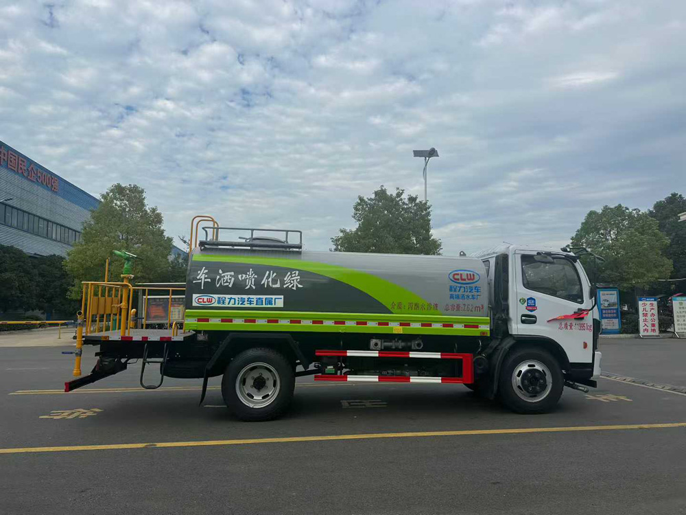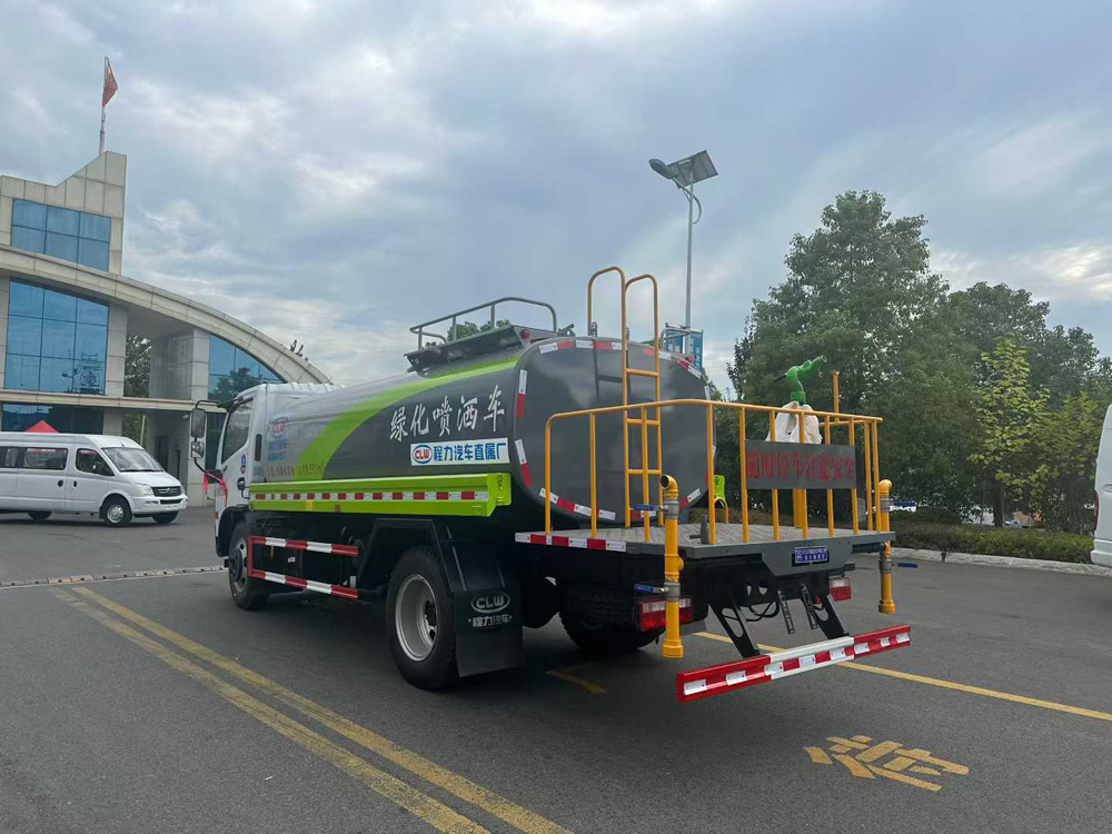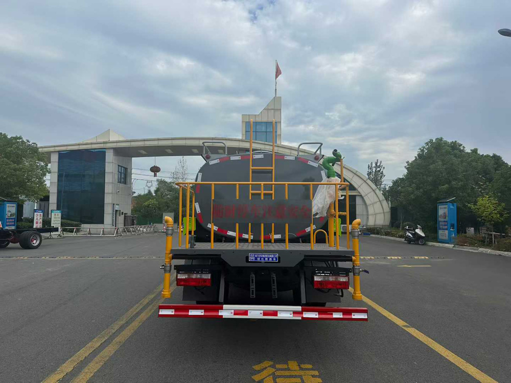 三、選裝配置: 選配駕駛室內電控氣動操作;大鴨嘴前沖噴頭壹對;萬向前沖球閥;路面沖洗水管卷盤;本田高壓水泵,水槍可沖洗人行道、移動洗車等; 藥盤;長警燈,LED箭頭燈;罐側帶閘門,罐后加裝噴霧降塵裝置;灑水車泵標配程力泵選配杭州威龍泵;可對主管道加粗,可選316大口徑球閥;罐體內防腐、保溫、襯塑處理,灑水車作運水車用可加裝自流口。運熱水罐體可做保溫,運生活用水可做食品級304不銹鋼罐體。